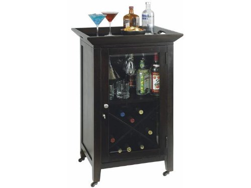 Howard Miller Butler Wine Bar Cabinet is finished in Black Coffee on select hardwoods and veneers, with brushed satin nickel knob. This cabinet includes a wood stemware rack for wine glasses, and storage for glassware, spirits, and other accessories. The "X" design wine rack stores up to 14 bottles. Removable top serving tray. The door features beveled glass. Locking door secures your wine and spirits. Four antique brass ball casters (not shown) make this unit portable. Dimensions: H. 38-1/4" (97 cm) W. 24" (61 cm) D. 19-3/4" (50 cm)